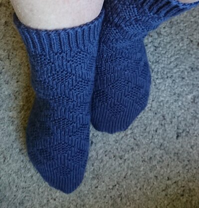 Leg and foot length is adjustable to the wearers preference, yarn requirement will vary.