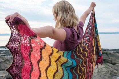 Worked on the bias, this generous rectangular shawl creates bands of colour that ripple across the shawl from end to end.