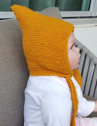 This cute 8ply/DK Pixie Bonnet is worked in moss stitch and has an under chin tie. It is very quick to knit and is perfect for keeping baby's head, neck and ears warm.