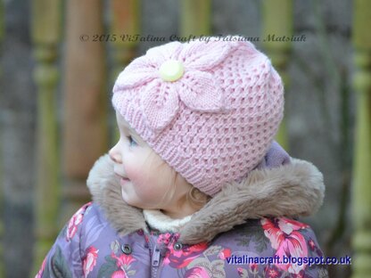 This beautiful knitted hat is perfect for end of winter and beginning of spring time. It is knitted with honey comb pattern and decorated with large flower.