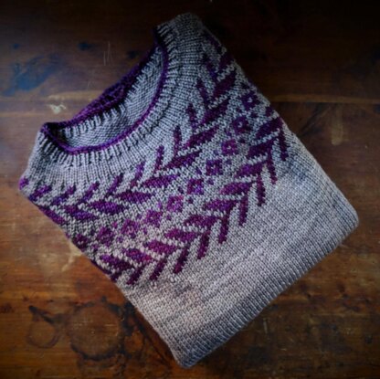 Chevron Flight Sweater is worked from the bottom up in the round. First the body is worked straight to the underarms. Next, two sleeves are made, then knitted on to the body. Short rows are worked to start shaping the back of the yoke. Once the colorwork and yoke shaping are complete, the last few short rows are worked to raise the back of the neck.