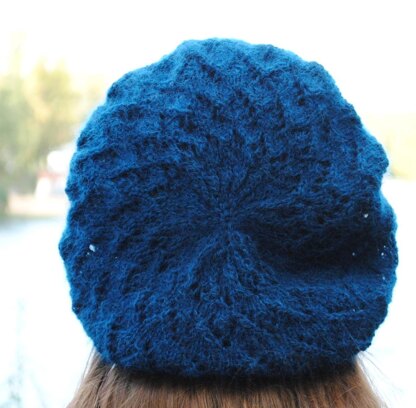 Work this hat in a classic beret size or a bit bigger for a slouchier hat. It is knit with one strand each of fingering wool and kid mohair to give it a nice vintage feel and halo while keeping your head warm. The chevron lace adds even more classic charm. Get a ball of merino and use up some fingering yarn. The simlpe lace pattern is easy to memorize and your new beret will be finished in no time!