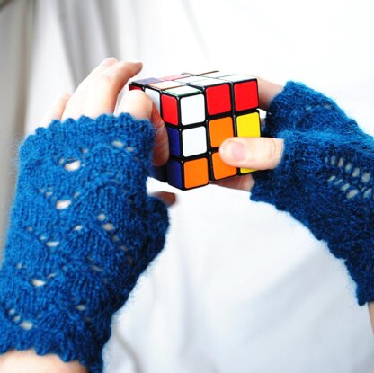 These cute little mitts keep your wrists warm while knitting, speed cubing or whatever else is occupying your fingers. They are worked in the round in an easy-to-follow lace pattern which matches the Cevron Lace Beret. The mitts feature picot edging on both ends, and are knit with one strand each of fingering weight wool and kid mohair to give a nice vintage feel and halo.