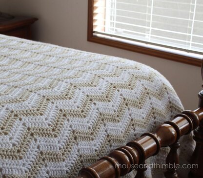 Top twin, full, queen, or king beds with a classic 2 color zigzag design. Easy enough for a beginner with basic crochet skills. Pattern is quick to catch on to and memorize.
