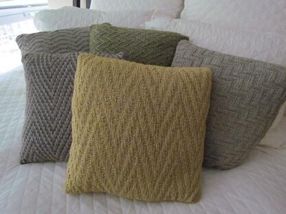 The Pillow #1 is a broken 2 x 2 ribbing to form an elongated chevron giving the effect of a mock cable design. The sample pillow was knit with the pattern on both sides, instructions are included for knitting a plain back if desired. Blocking and assembly instructions are included.