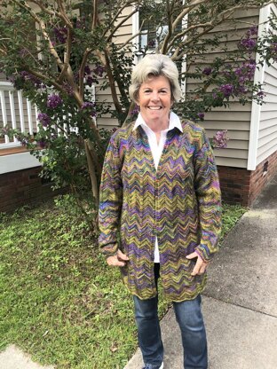 The color pattern was inspired by the Fibonacci sequence, creating a stunning appearance that mimics designs found in nature. The colors effortlessly complement the trendy chevron stitch pattern, and a simple garter trim along the neckline finishes the look for a fabulous piece that will give you plenty of styling options.