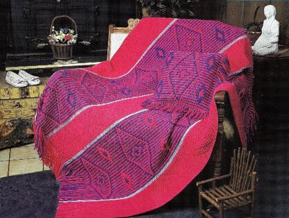 Dramatic Native American Indian themes. Instructions for 50 3/4" x 64" afghan and 12" square pillow. Easy to do...there are NO color changes within a row. It is an optical illusion with the multicolor section design being achieved by the dropped dc in the rows (you work one row in the blue yarn, the next row in the rose yarn, etc.)