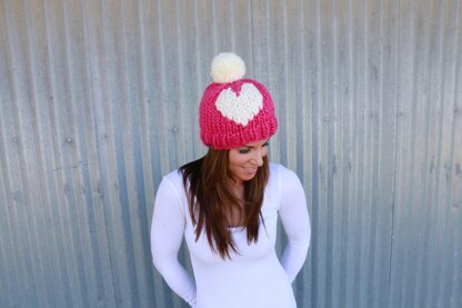 Love is all you need. This fun heart hat will have you and the people around you smiling. It is a great Valentine's day gift or any day gift to tell someone close to you how much you care. The pattern using duplicate stitch to create the heart pattern.