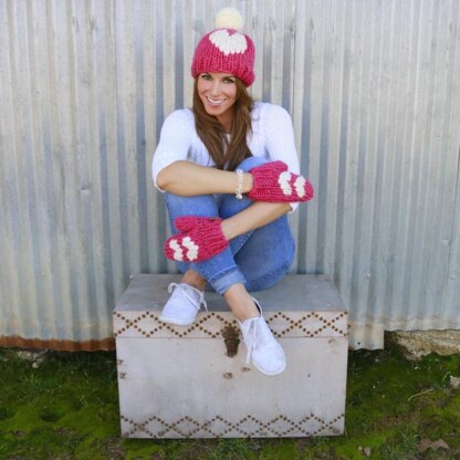 We designed these adorable mittens to remind us that love is all you need. They are knit in the round, or, if you're feeling feisty, try making them at the same time in magic loop. The double heart design on the front is made by duplicate stitch.