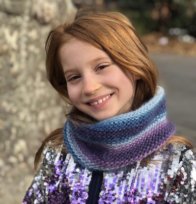 I designed this cowl for my daughter to keep warm while playing, as it won't slip off. It's cozy but lightweight. It's easy to knit in the round, uses only a small amount of yarn (half a ball of Louisa Harding Amitola Grande) quick to make and features hardly any woven in ends!