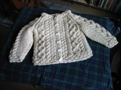 Traditional cable stitch Aran Jacket with raglan sleeve, bramble stitch border and button up front. Buttons can be placed either side to suit gender.