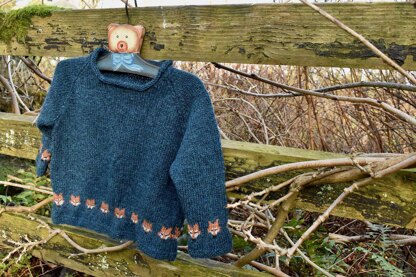 It is knitted in 4-ply, from the bottom up. It is seamed, and has raglan sleeves. The bottom and cuffs have a border of garter stitch, although this could be altered to rib if you prefer that, and the neck is a simple roll collar. You need a small amount of two additional colours for the foxes, and a tiny bit of black for their eyes and noses, which are embroidered on at the end.