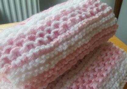 This pattern for a baby blanket looks a lot harder than it us! The pattern is created with the Chinese Wave Stitch (thats just knit and slip) and also garter. Created in two colours the different stitches and wool effect make this a super warm blanket which is very pretty to look at. Made with 9mm needles and 3 balls of 100g yarn. The pattern can be easily adjusted to make it bigger. Finished size as per the pattern will fit a moses basket, car seat and pram