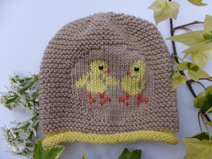 This cute chicks baby hat has a roll brim and a garter stitch body with a stocking stitch 'circle' for the chirpy chicks motif. The chicks are added using duplicate stitch once the hat has been knit, however they could be added whilst knitting by using the intarsia method. Beads are used for the chicks' eyes, but these could be replaced by a couple of duplicate stitches in a dark shade yarn. The hat is knit flat on two needles with a seam at the back using DK weight yarn. The pattern includes row by row written instructions, charts and photos.