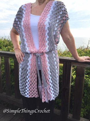 The Chloe Vest is long, light, soft, and beautiful! It’s gorgeous with the belt or without. And the open stitch makes it a great choice for warm weather. This vest is super quick and easy to crochet, and the Coboo yarn from Lion Brand doesn’t feel heavy and warm on your lap as you’re working it so it’s a relaxing piece to do at the beach or just hanging out on the deck this summer! You’ll enjoy making it as much as wearing it!! The vest measures 20” wide x 60” long (each panel is 10” wide x 30” long) and the belt is 1 1/2” wide x 58” long without fringe. Fringe is approximately 5” long. This pattern is written in one size but is easily adaptable. You will need 3 skeins of Lion Brand Coboo in Silver, 2 skeins in Pink, and 1 skein in White.