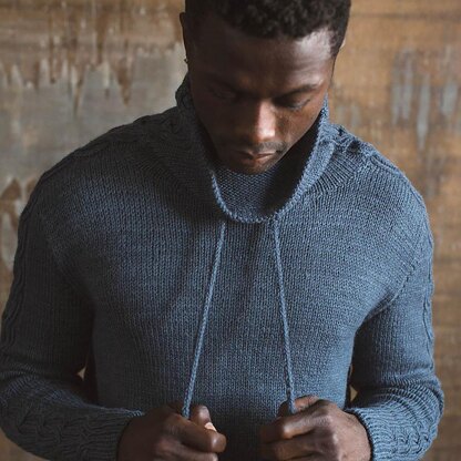 The Nelson Pullover is a modern knitter’s take on men’s athletic wear. This sporty, youthful pullover features a continuous cable that runs up the sleeve and shoulder into the cowl neck. The drawstring ties add charm as well as warmth in cold weather.
