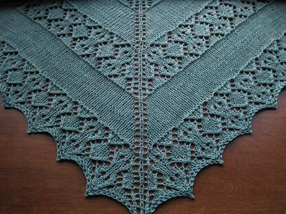 Chosen Path is a lace shawl shown in three different weights of yarn, knit in one piece from the center-top outward. With both charts and written instructions, knitters are able to choose the most comfortable way to follow the pattern.