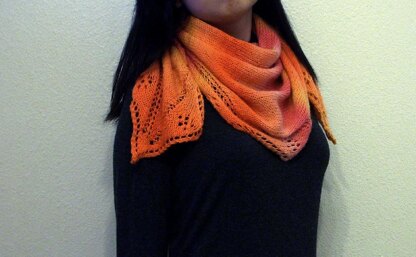 This shawl is worked from point to point, and the edging is worked as you go, so you can work until less than half of your yarn is gone before working the second half. There are instructions for a triangular (scarf) and a trapezoidal (shawl) version.
