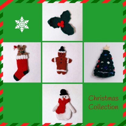 Using leftover yarn in my stash, I created this Christmas Collection for a gift exchange party I was invited to. The pattern includes instructions for a snowman, a gingerbread man, holly, a Christmas tree and a Christmas stocking with a teddy bear and candy cane.