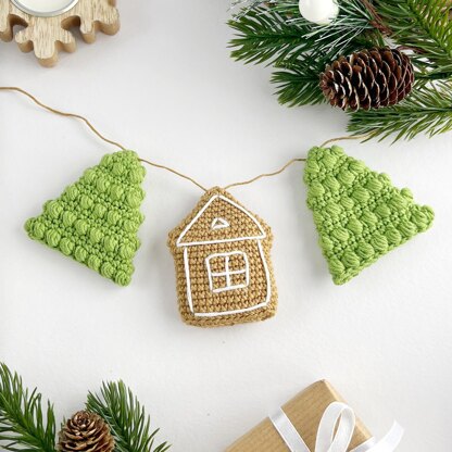 Christmas crochet garland no sew pattern Gingerbread house and mini Christmas tree decorations Amigurumi pattern ornament