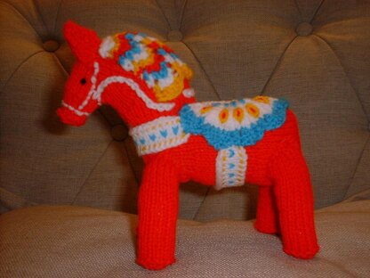 Want to knit something a little different for the festive season this year? Try this sweet Swedish Dala horse. The stocking stitch body parts are knitted first then sewn together to make the horse shape. The brightly coloured saddle, straps and mane are knitted separately then attached. It will sure to catch the eyes of all who see it!