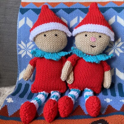 Easy to follow knitting pattern to make a pair of cute Christmas elf dolls.