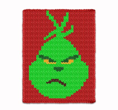 Finger Knitting Pattern PDF – Grinch Knit Blanket is a festive christmas red design perfect for the xmas holidays. Worked in stockinette stitch, this cheerful project makes a cozy bulky jumbo #7 yarn super chunky crib throw, afghan, or Xmas blanket for a newborn, baby, toddler, or child. Knit it using the included colorwork Grinch face chart, row-by-row written instructions, or easy color blocks — beginner-friendly and ideal for cozy finger knitting!