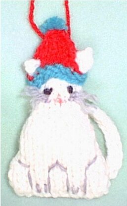 Cat lovers, rejoice! There is a cute kitten waiting to be knitted up, and wants to hang on your Christmas tree! This is fun, fast and easy to knit. The kitten is so cute with its own Santa style hat too! Uses worsted weight yarns knitting needles, US # 7. You can knit these up in all sorts of cat colors if you wish! Finished size is about 4 inches tall. Children love to see this hanging on the Christmas tree!