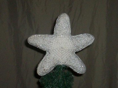 This glittering silver and white star will really set off your Christmas tree. It is made with about 3 ounces of worsted weight yarn with silver metallic thread worked in. It has an inside pocket for the top of your tree and is stuff with a small amount of Dacron batting.