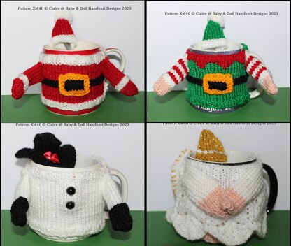 KNitting pattern to make four different Christmas mug cosies with matching teaspoon hats. Simple to knit in an afternoon, these make a great gift with a nice mug!