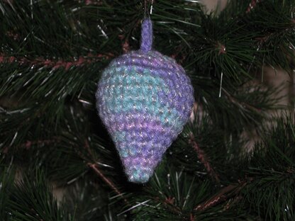 This adorable little sparkling pointed ball ornament will look great on your Christmas tree. It is made with scraps of worsted weight yarn and a small amount of Dacron stuffing. I designed a whole series of these, because I adopted a cat who loved to climb the Christmas tree. Obviously, they are pet- and kid-proof and washable, too.