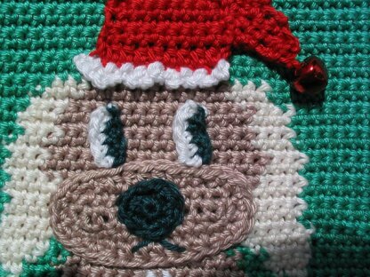 This is an original pattern for a colourful crocheted double thickness potholder with a cute Christmas puppy on the front. The reverse is plain red, and both thicknesses are joined by a double row of crochet in red.