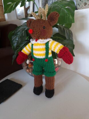 All my patterns are knitted flat on two needles. I do not use 'in the round' in any case or any detail. I try to make my patterns as basic as possible so people with less experience can have a go at them. Do not hesitate to contact me if you are unsure about a pattern. This Reindeer matches the Santa Claus and Pickle the Elf dolls.