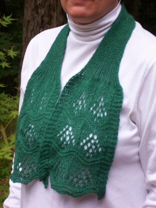 Christmas trees on a cozy scarf knit with a blend of cashmere (50%), silk (25%) and merino wool (25%). A versatile and sophisticated classic to wear throughout the Holiday season – as an ascot, with the ends hanging loose, or anyway you’d like – this scarf reduces bulk by having the neck portion ribbed on fewer sts than the Christmas-tree Lace portion.