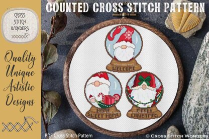 3 Adorable Christmas Snow Globes counted cross stitch designs!\n\nCross Stitch designs by Marcia Manning.\n\nEach Snow Globe is 64 stitches wide by 81 stitches high.\nSize 11 count: 5.82 x 7.36 inches or 14.78 x 18.70 cm\nSize 14 count: 4.57 x 5.79 inches or 11.61 x 14.70 cm\nSize 16 count: 4.00 x 5.06 inches or 10.16 x 12.86 cm\nSize 18 count: 3.56 x 4.50 inches or 9.03 x 11.43 cm\n\nStitch the words in the base to your liking or omit words entirely.