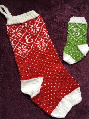 Digital knitting pattern for two festive Christmas stockings with initials.