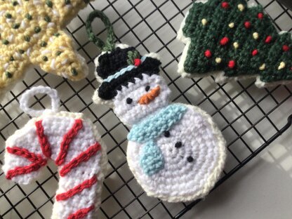 The Christmas Sugar Cookie Snowman Ornament. Soft, chewy, sugar cookies. Festively decorated with bright icing. Captor the memory of all those Christmas cookies baked over the years with these adorable, and delicious, looking crocheted ornaments!