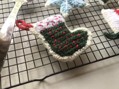 The Christmas Sugar Cookie Stocking Ornament. Soft, chewy, sugar cookies. Festively decorated with bright icing. Captor the memory of all those Christmas cookies baked over the years with these adorable, and delicious, looking crocheted ornaments!