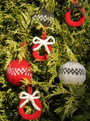 The bauble measures 8 inches around, and stands 3 inches high, and the wreath is about 2.5 inches across. Instructions for both decorations are included in this pattern, along with instructions for any special techniques.