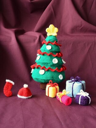Here’s a lovely Christmas Tree crochet pattern, including the patterns for 4 different Christmas gifts, Christmas ornaments and the garland, a stocking and a Santa Claus Hat.