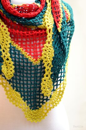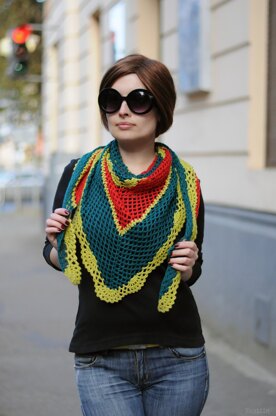 Detailed crochet pattern for easy and lightweight crochet triangular scarf with beautiful wavy edging in bright colors, instant sophistication of your casual look and a burst of color on a cloudy winter day. Great statement accessory wearable any season, fun to make Christmas gift for Mom or sister or a friend!