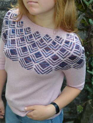 CHRYSTAL got its name because of the elegant geometrical pattern on the colorwork yoke reminding me of the sparkling minerals. It is a seamless top-down sweater with ¾ sleeves for which I used a very calm and neutral main color with the matching wild variegated contrast color and I just like the effect this combination produced.