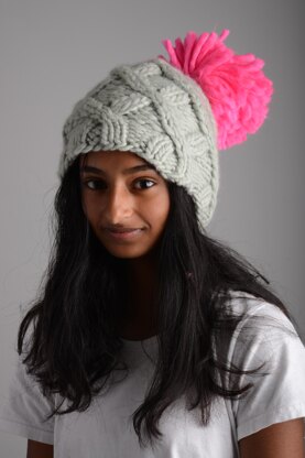 You will need:2 skeins of Plump (shown in Peppermint Cream) Contrast for pompom (shown in Bubblegum) Stitch markerTension: 10 sts to 10cm in stocking stitch on 10mm needles