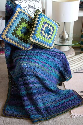 My latest blanket design consists of a rather easily memorized two-row lace pattern that, worked in a yarn with long color runs, does the bulk of the heavy design lifting. Use the double trim rows along the border as a color anchor: for this jewel-toned main yarn, a drab olive was perfect.