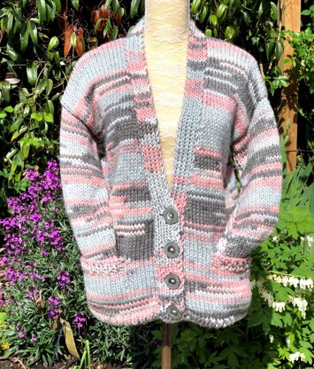 A perfect cosy, casual cardigan with pockets. Simple stocking stitch and 1/1 rib. Great for a beginner.