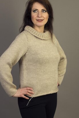 The sweater is knitted flat from the bottom up, with the back, front, and sleeves worked separately, and then sewn together. The collar is formed by picking up stitches around the neckline after the right shoulder seam has been joined. The main body of the garment is worked in stocking stitch without a rib to give a rolled edge. The cowl neck collar is knitted in single rib stitch using the larger needles to give a looser effect.