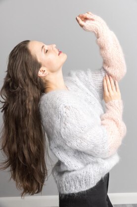 The pictured sweater is knitted in light grey 56 and powder 63 -> Find all Ingenua Mohair colors in our shop.