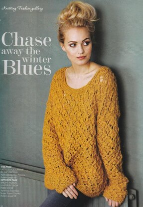 This is a pattern for a Chunky Lace Sweater, originally published in Knitting magazine Dec 2012. It is in chunky Paloma yarn with a simple lace pattern and garter stitch edges. Photo Laurel Guilfoyle for Knitting magazine.