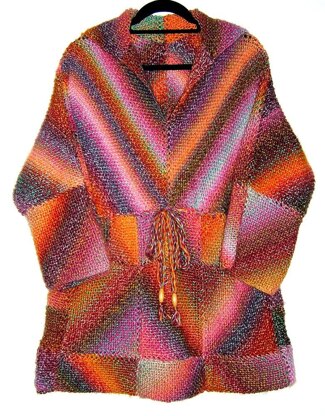 From a collection of 'easy knit' patterns created entirely from a combination of simple knitted squares, this is a chunky weight warm tunic top with tie cord and open collar.