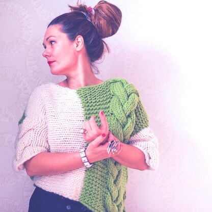 Chunky sweater craze was the inspiration for this Asymmetry Sweater - knitted top-down and side to side in 5 pieces, sewn together at the end. It is a fairly easy and quick knit, however, if you are not a long-time knitter, you might need to invest some time in getting a grip on some new techniques, like big, prolonged cables and horizontal to vertical seaming.